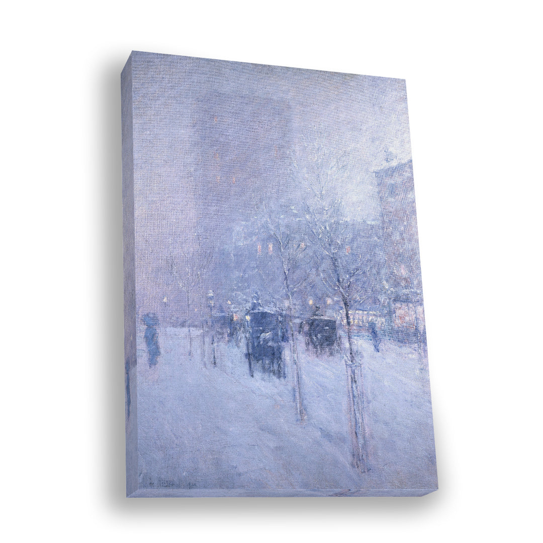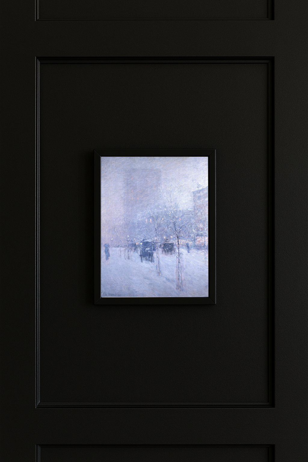 Snow drifts softly through a quiet city street in Blue Christmas, painted in 1892 by American Impressionist Childe Hassam. Bathed in cool tones of blue and violet, the scene captures the hush and beauty of winter’s stillness.