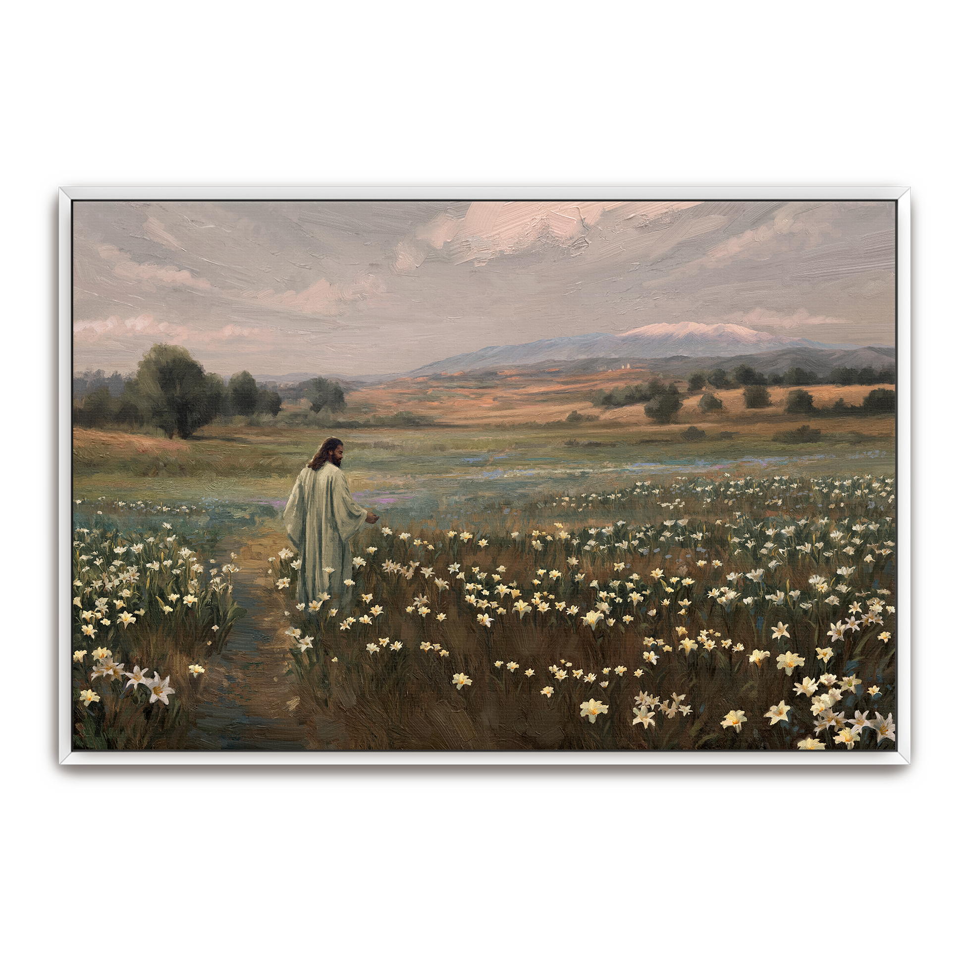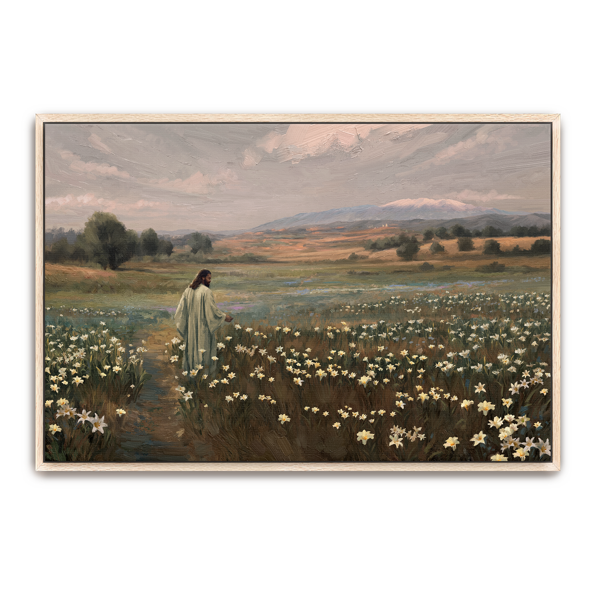 Consider the Lilies is an original oil painting inspired by Jesus’s words, “Consider the lilies of the field, how they grow.” Jesus walks a wildflower meadow under a soft sky. The scene feels calm, simple, and alive. Hang it as a gentle reminder that God grows beauty without strain and that we are invited to grow the same way, steady and sure, right where we are.