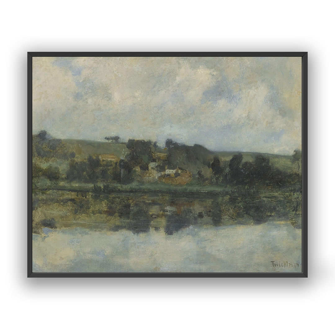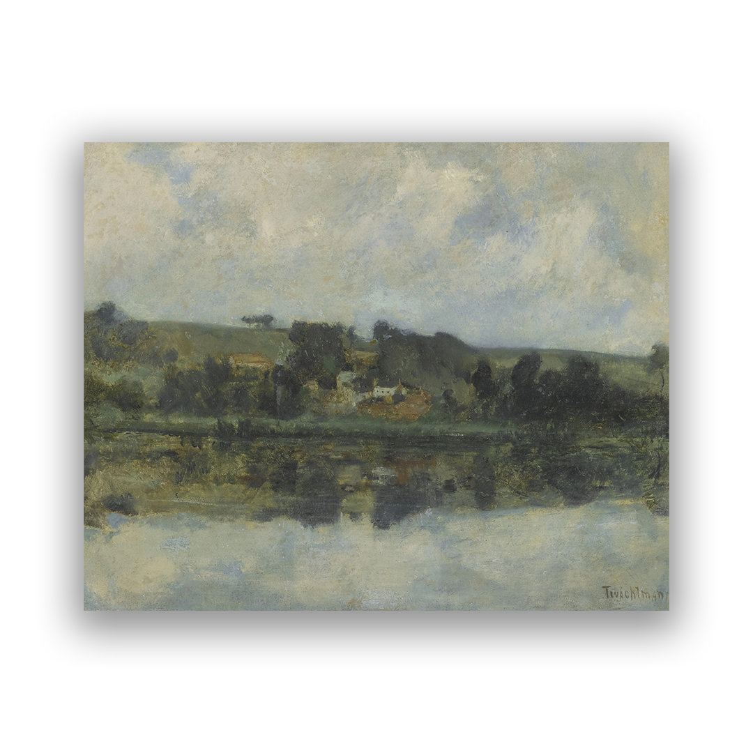 A small village appears across the water in Reflection, its colors softened into a haze by sky and river. John Henry Twachtman’s brush lends the scene an almost dreamlike stillness.