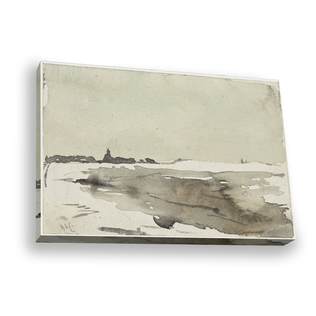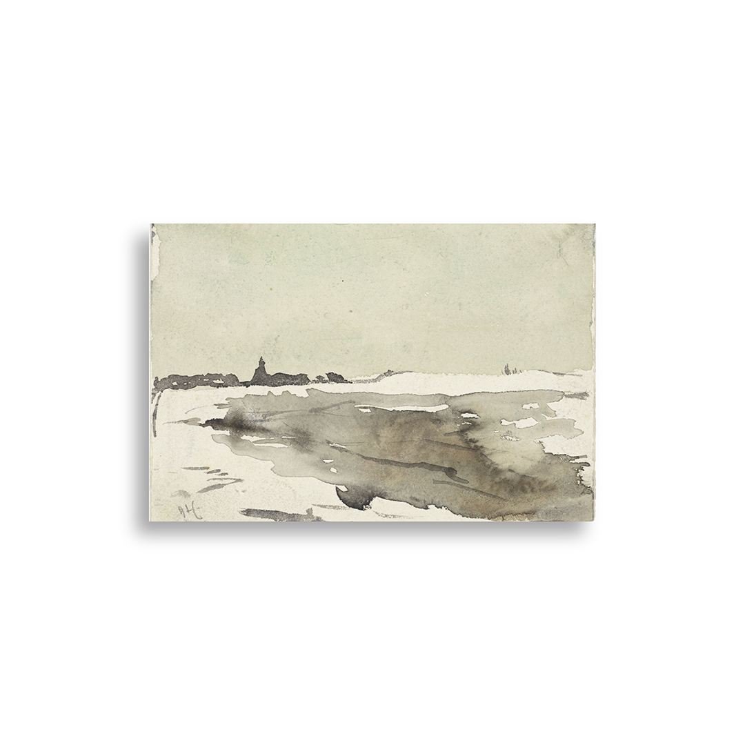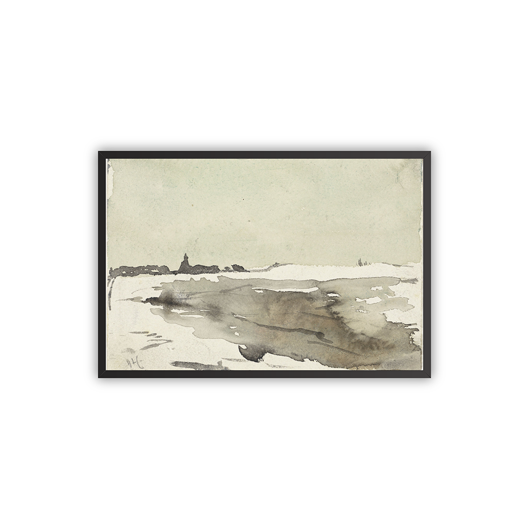 Snowline depicts a distant village under a pale winter sky, rendered in soft washes of gray and white. Created by Dutch artist Adolf le Comte, it’s a simple, atmospheric study that feels both modern and timeless.