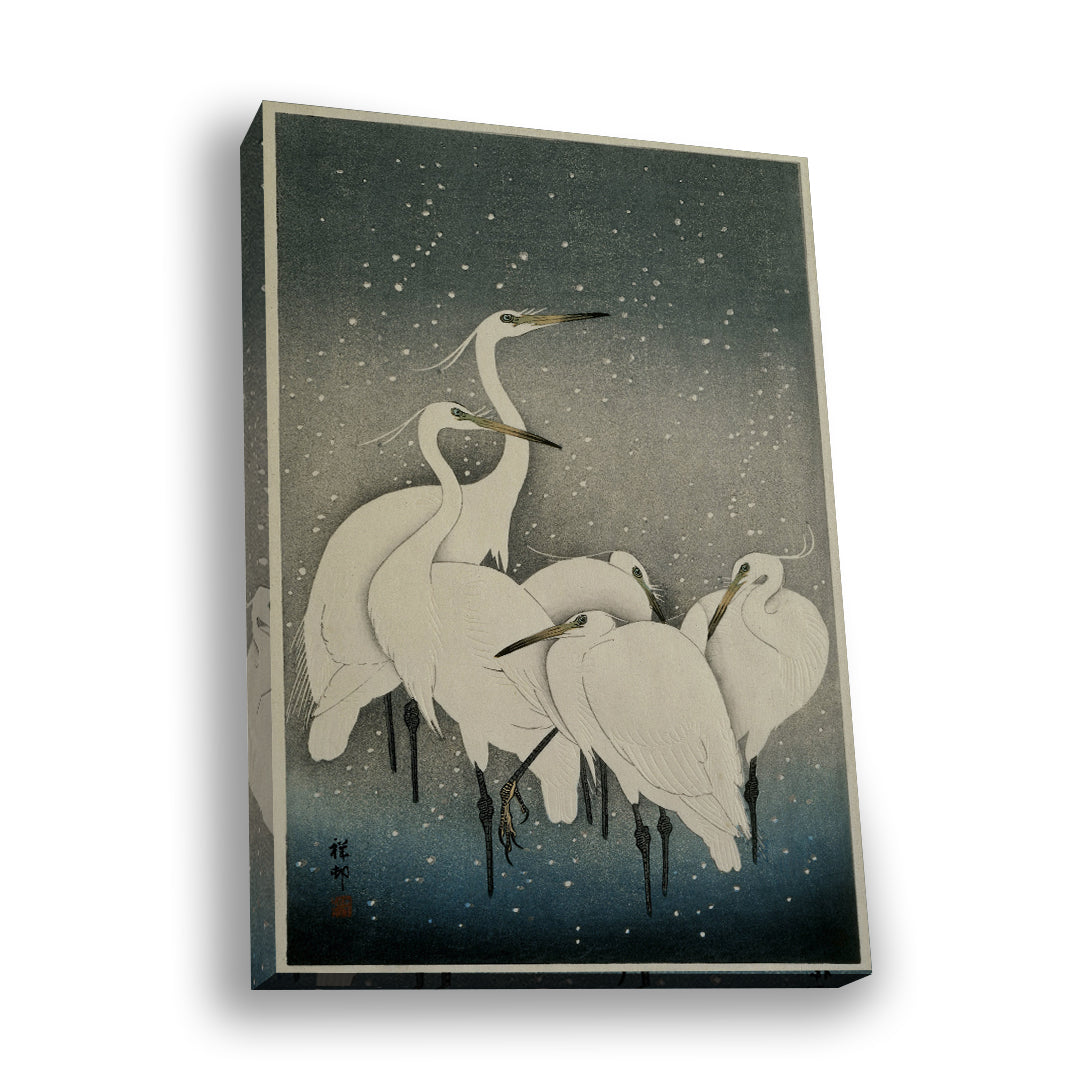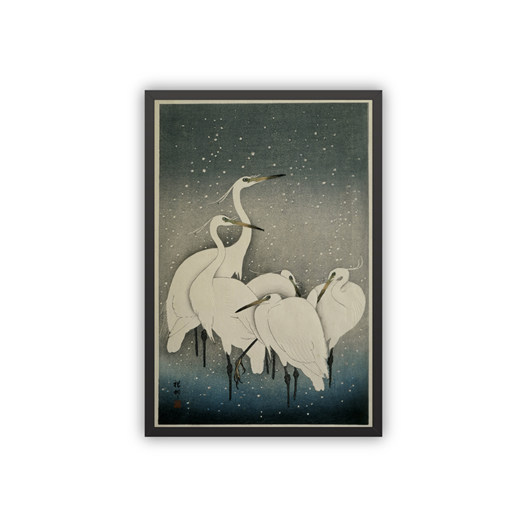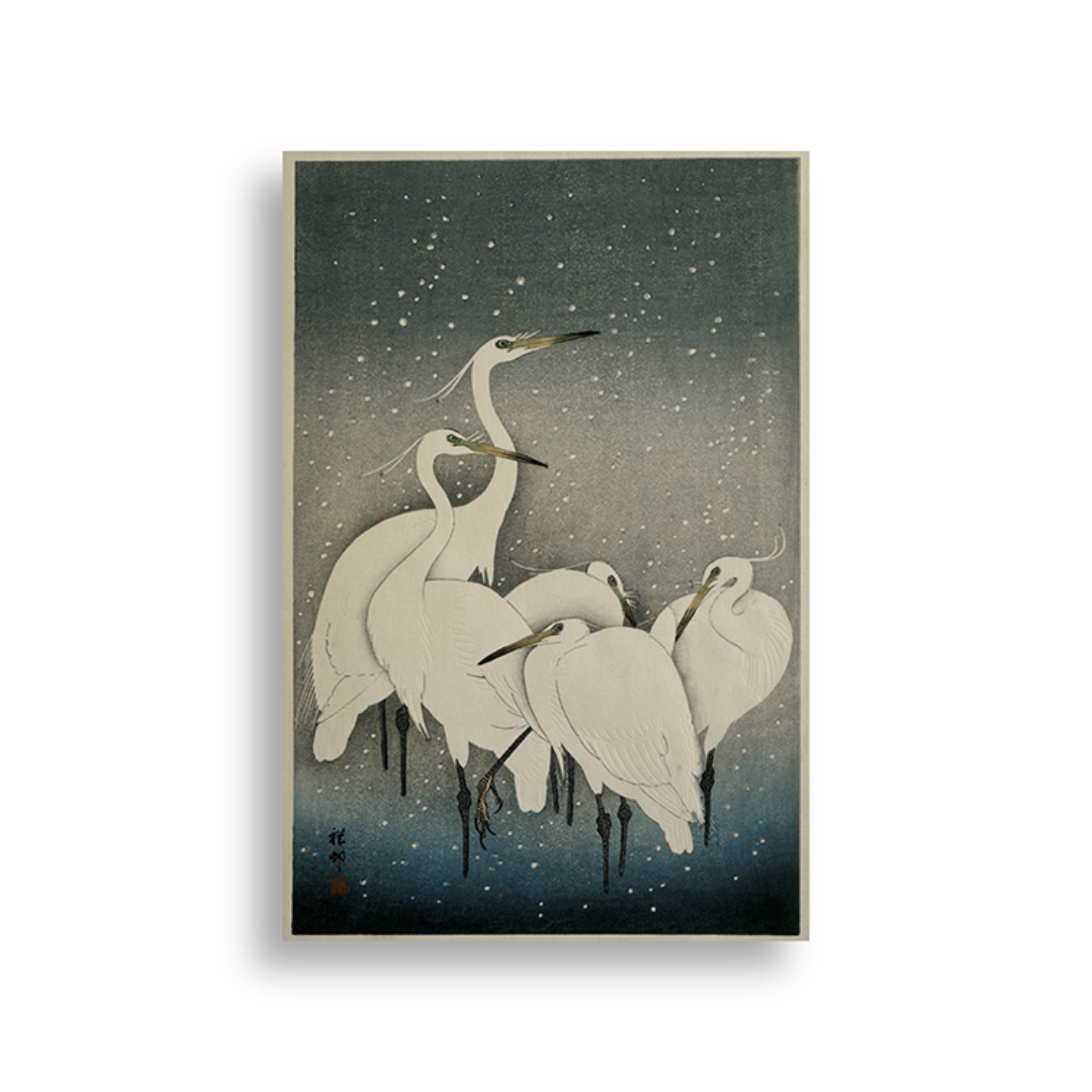 Five white egrets stand together beneath a falling snow in Starry Flight by Japanese artist Ohara Koson. The soft gradient and delicate detail make this piece both serene and striking.