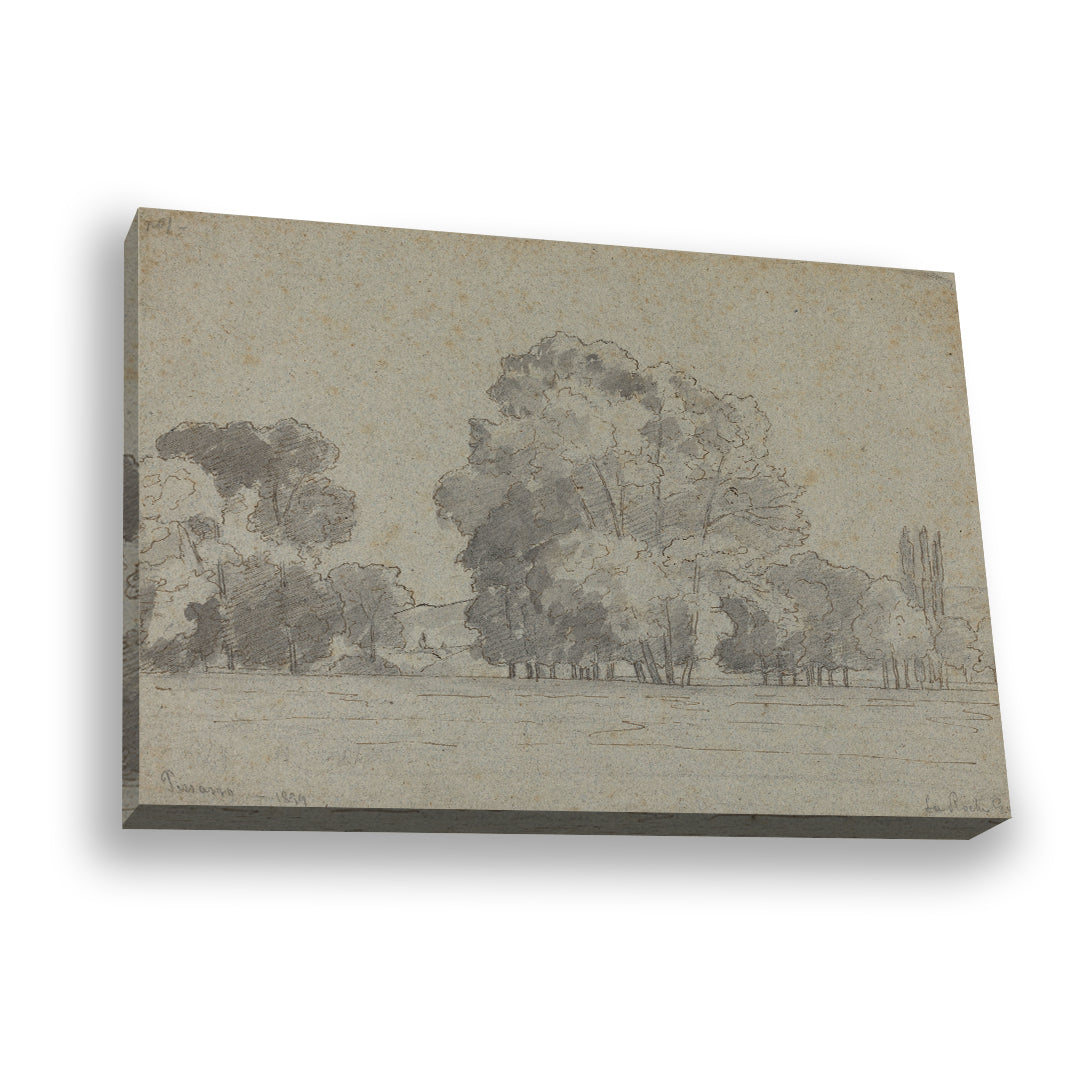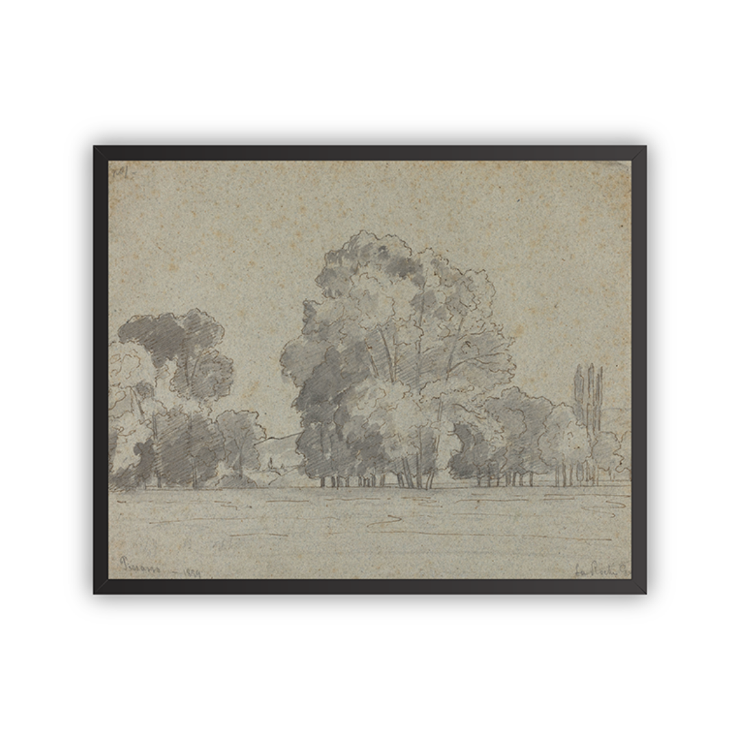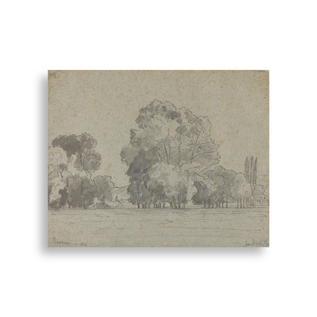 Soft pencil shading brings depth to a quiet grove of trees in Stillness, drawn by French artist Camille Pissarro in 1894. Simple and balanced, it reflects the ease and patience found in nature.