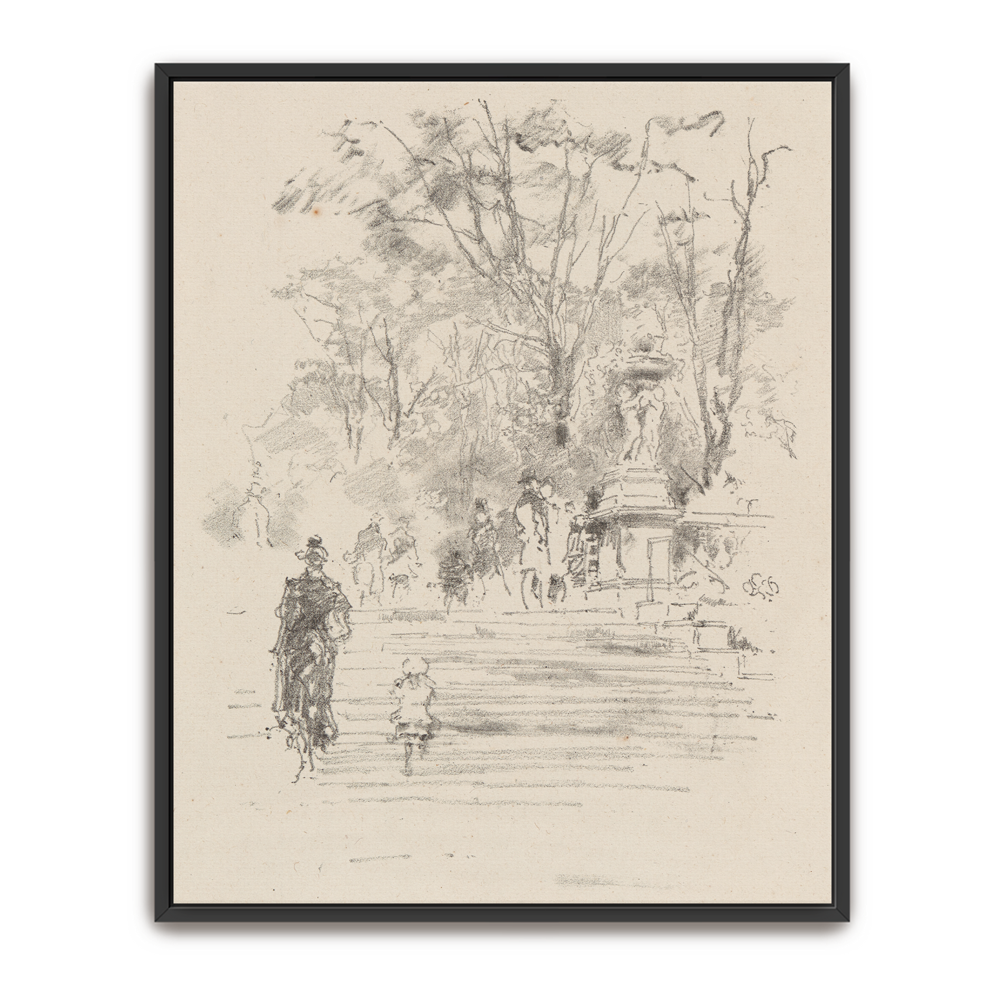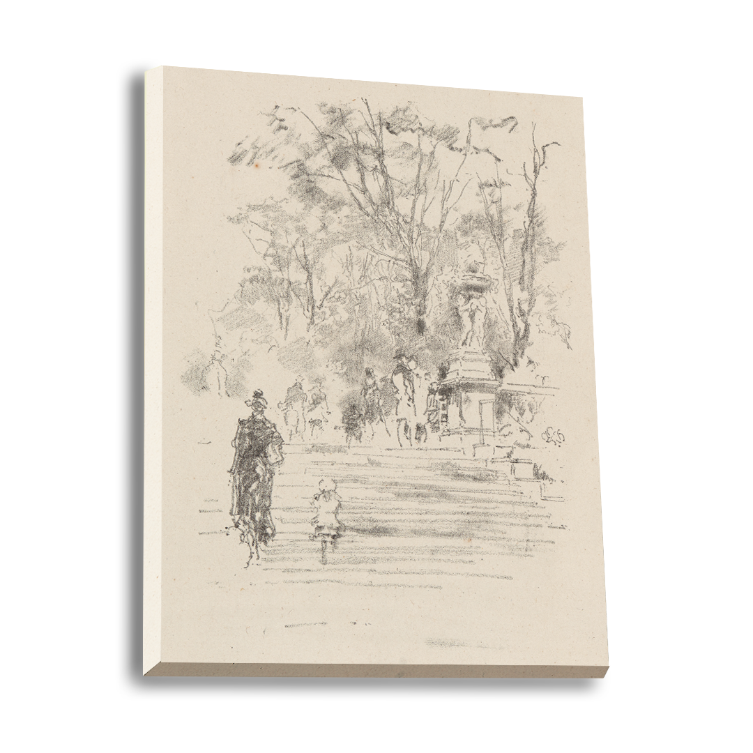 Figures gather casually around a monument in Stone Steps, Paris, their gestures loosely drawn in graphite. Sketched by James Abbott McNeill Whistler, the work preserves the fleeting energy of Parisian city life.