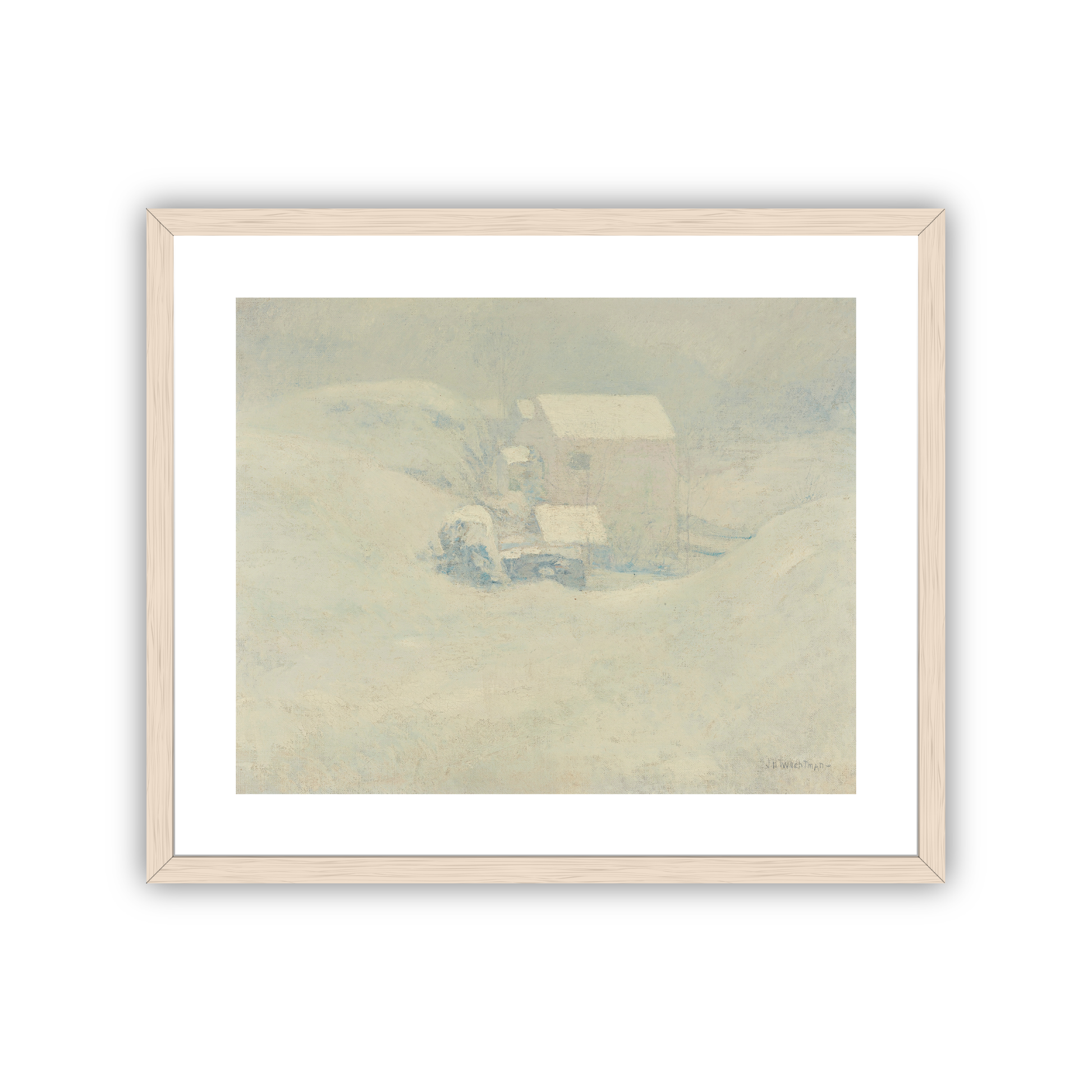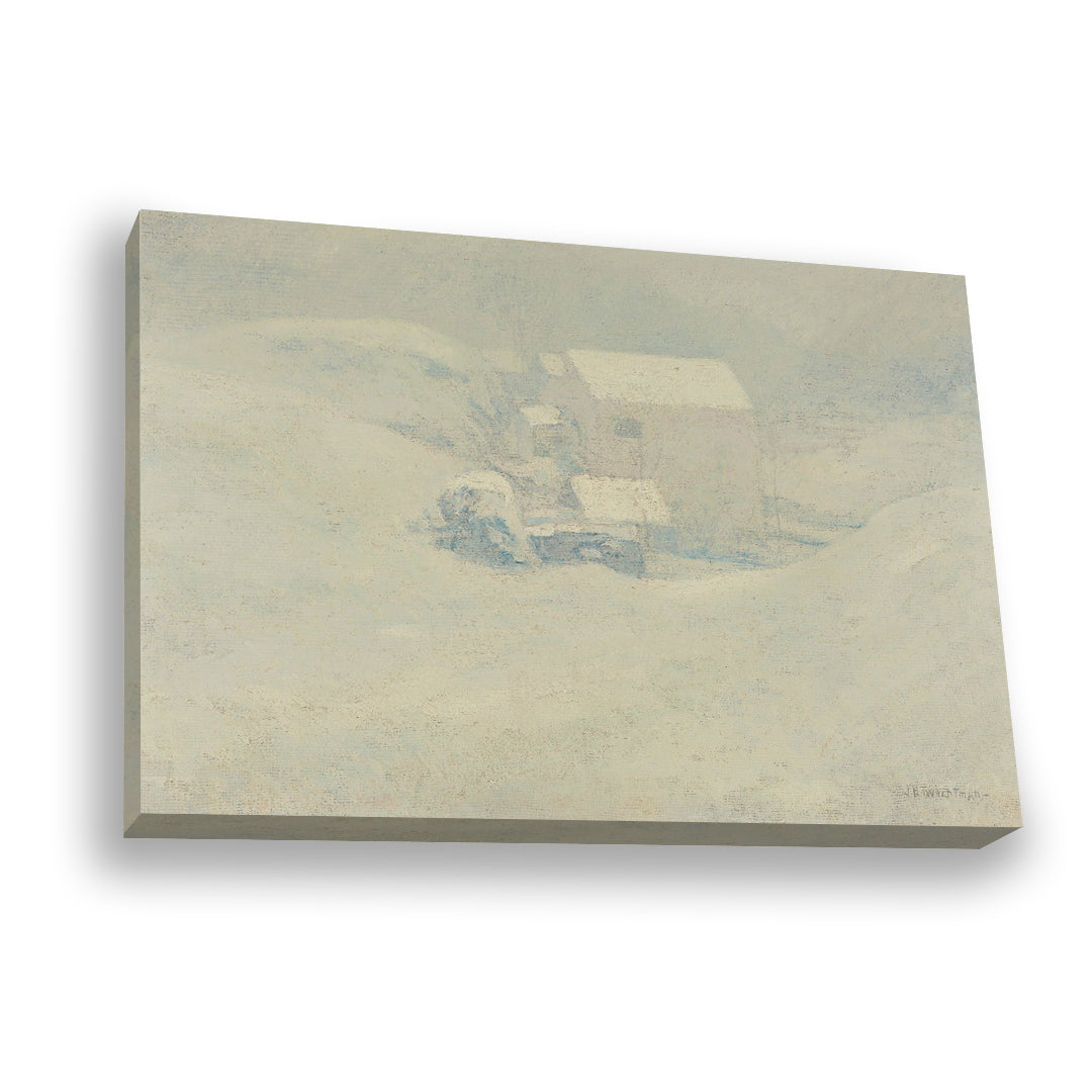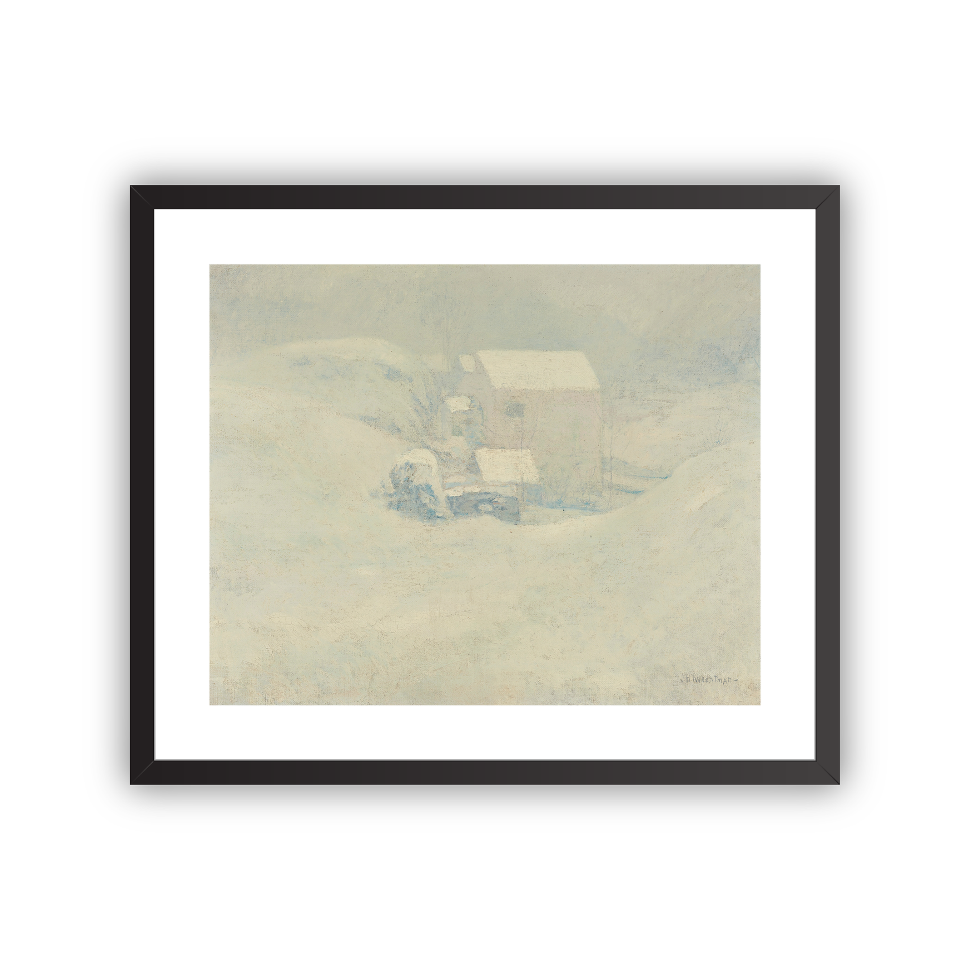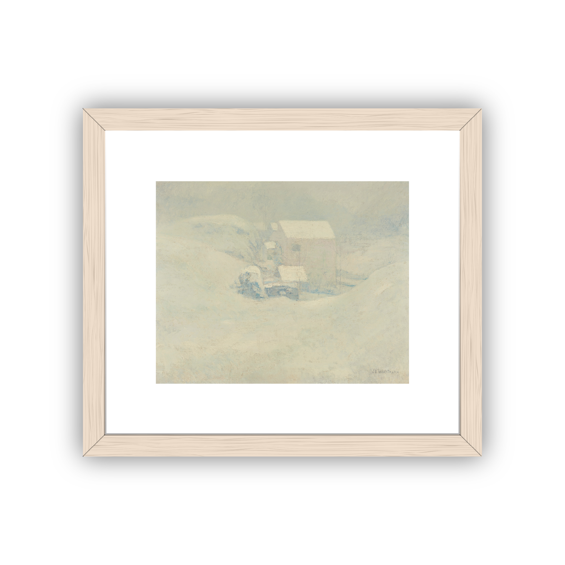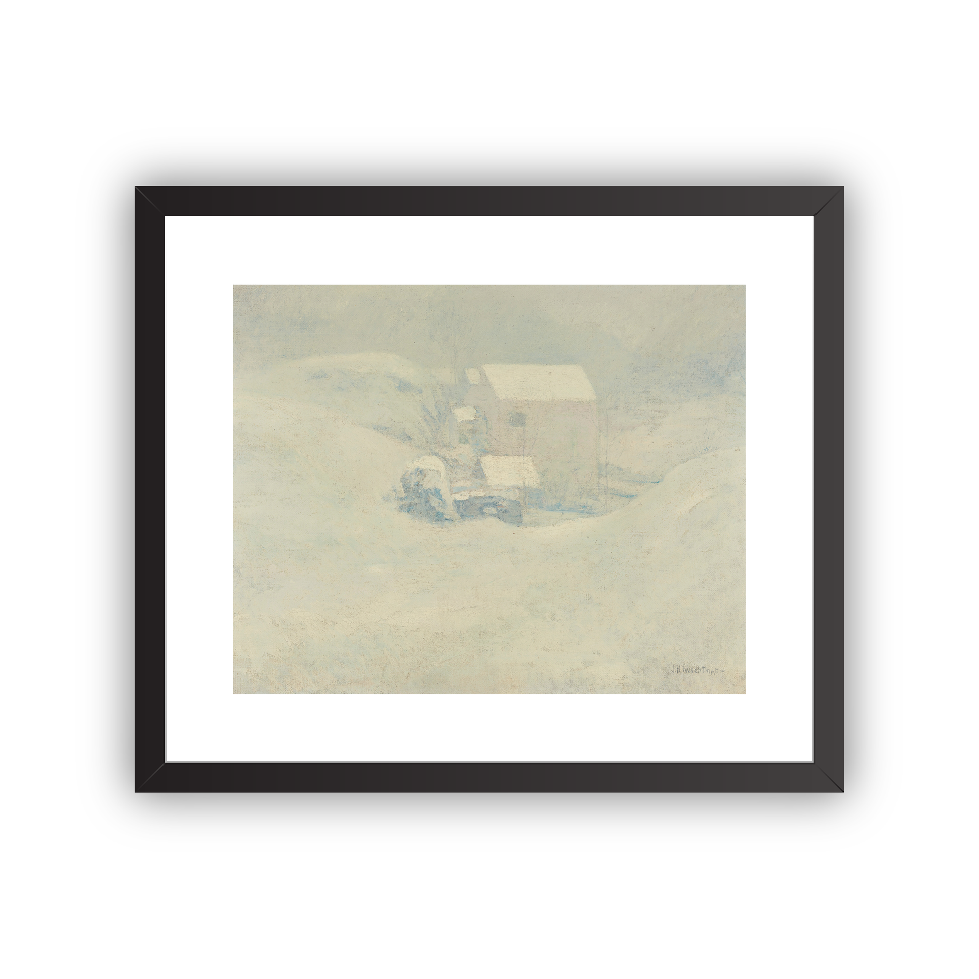 White Barn shows a farmhouse nearly hidden beneath fresh snow, painted by American Impressionist John Henry Twachtman. Its soft palette and texture make the scene feel still and understated.